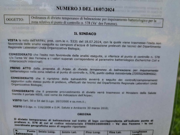 La cronaca. Un controllo dell'Arpa sulle acque dei laghi di Revine Lago riscontra una presenza di batteri fecali - Escherichia Coli e Enterococchi intestinali- oltre i limiti di legge, batteri che possono causare sintomi e segni con diarrea, nausea, vomito e febbre.